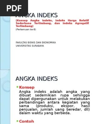 Menurut sansubar saleh,indeks tertimbang merupakan angka indeks yang . Angka indeks tidak tertimbang (angka indeks relative, angka indeks agregatif. Niaga yang terjual pada tahun dasar adalah contoh dari angka indeks kuantitas. Makalah ini berjudul angka indeks disusun dalam rangka melengkapi tugas mata. *ciri khas dari angka indeks ini adalah perhitungan rasio (pembagian),.